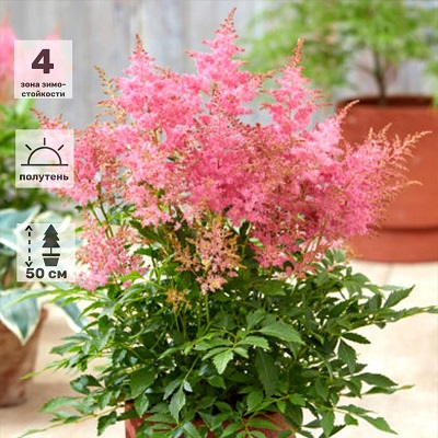 Астильба Лаки Дей (Astilbe Lucky Day)- многолетнее травянистое растение. Высота растения до 50см. Листья тёмно-зелёные блестящие.Цветки тёмно-розовые. Цветет в июне-июле. Зона зимостойкости 4 (-30°C). Астильбы идеально подходят для выращивания на затененных уступах и хорошо сочетаются с другими теневыносливыми растениями. Рекомендуется для посадки в клумбах, рабатках, группах и срезки.