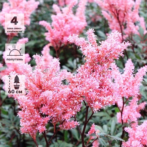 Астильба Лоллипоп (Astilbe Lollypop)- многолетнее травянистое растение. Высота до 60см. Листья глянцевые, зеленые, стебли красные. Соцветие розовое, плотное.Цветет в июле . Зона зимостойкости 4 (-30°C). Астильбы идеально подходят для выращивания на затененных уступах и хорошо сочетаются с другими теневыносливыми растениями. Рекомендуется для посадки в клумбах, рабатках, группах и срезки.