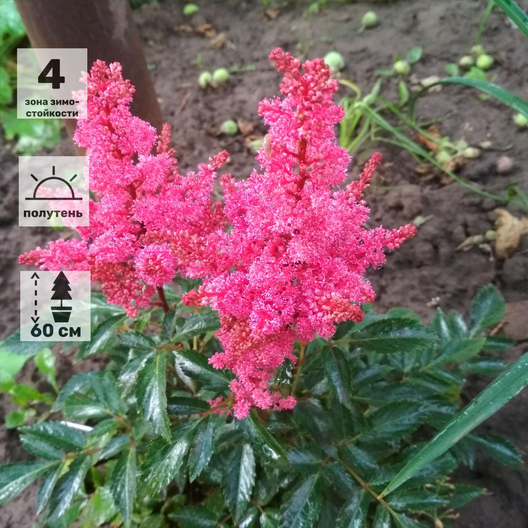 Цветки красные. Цветет в июне-июле . Зона зимостойкости 4 (-30°C). Астильбы идеально подходят для выращивания на затененных уступах и хорошо сочетаются с другими теневыносливыми растениями. Рекомендуется для посадки в клумбах, рабатках, группах и срезки.
