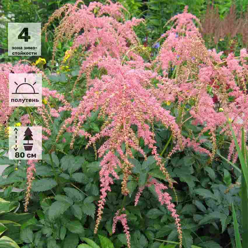 Астильба Тунберга Штраусенфедер (Astilbe thunbergii Straussenfeder)- многолетнее травянистое растение. Высота растения 80см. Листья орнаментные, сложные, дважды перистые, насыщенного зеленого оттенка. Отличительной особенностью астильбы является наличие бурых волосков на поверхности листьев. Цветы небольшие, диаметром до 4 мм. Они собраны в поникающие соцветия-метелки, которые по форме напоминают перо страуса, кораллово-розового цвета. Цветет в июле- августе. Зона зимостойкости 4 (-30°C). Астильбы идеально подходят для выращивания на затененных уступах и хорошо сочетаются с другими теневыносливыми растениями. Рекомендуется для посадки в клумбах, рабатках, группах и срезки.