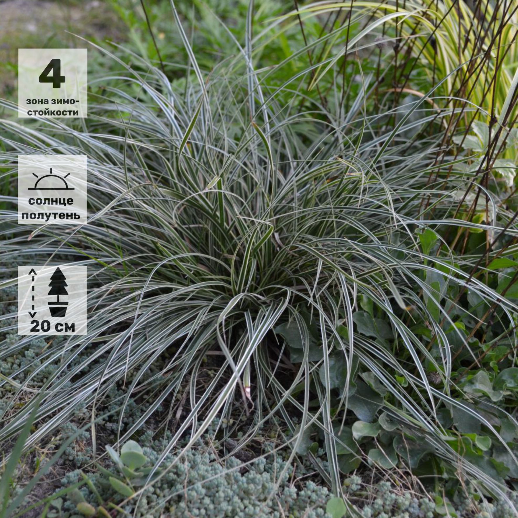 Осока птиценогая Вариегата (Carex ornithopoda Variegata). Очень декоративная зимне-зелёная осока, образует кочку высотой 20 см. Листья красиво изогнутые, узкие, тёмно-зелёные с кремово-белой полоской по середине. Соцветие из тёмно-коричневых колосков, расположенных по три в виде птичьего следа. Зона зимостойкости 4(-30С).